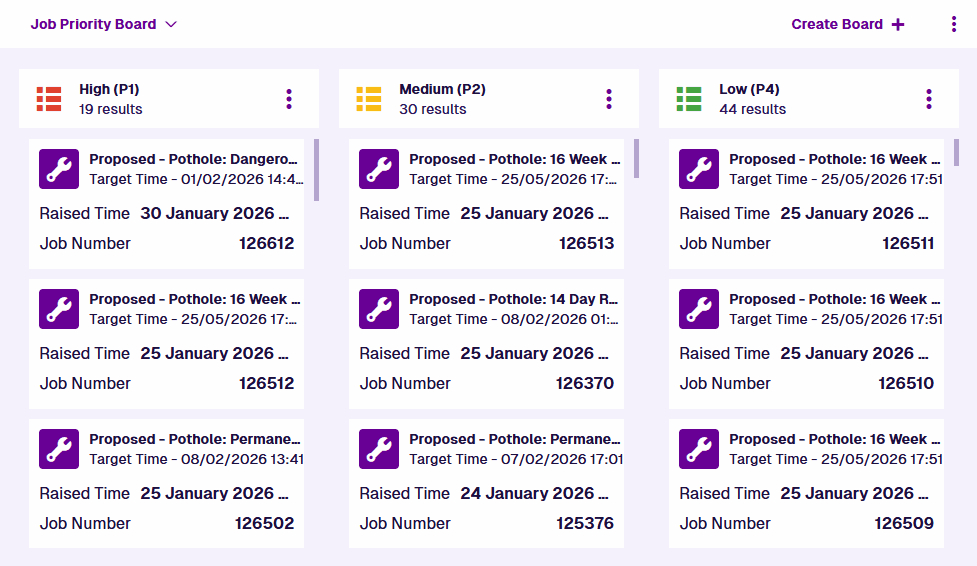 Filter query - use the AQS Builder to filter the items shown on the board by defining any number of required conditions, e.g. only fetch task items with a specific Status value, only fetch asset items with Geometry located in a specific area. Select Clear to remove the filter.