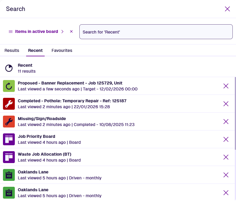 For a list of recently viewed items and boards, open the Recent tab. To remove an item from the list, select its button.