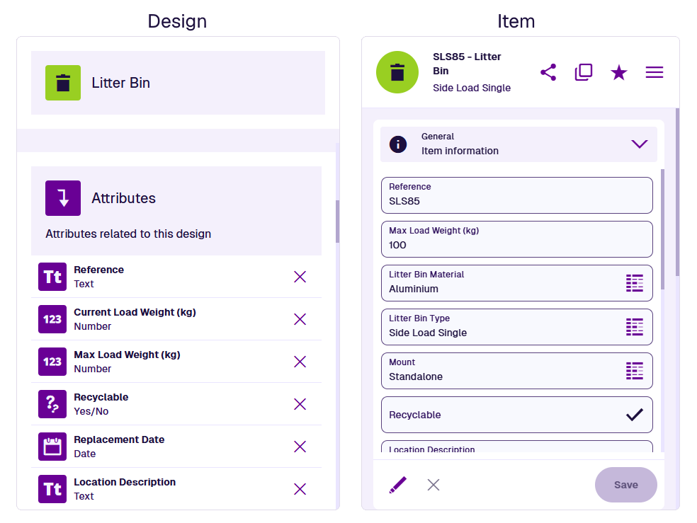 To enter data in CausewayOne Asset Management, you can create items of your designs. When creating or editing an item, you can populate its attributes with values to represent a specific instance of that design. Items can subsequently be queried to fetch their attribute data, which can be filtered and sorted according to your needs.