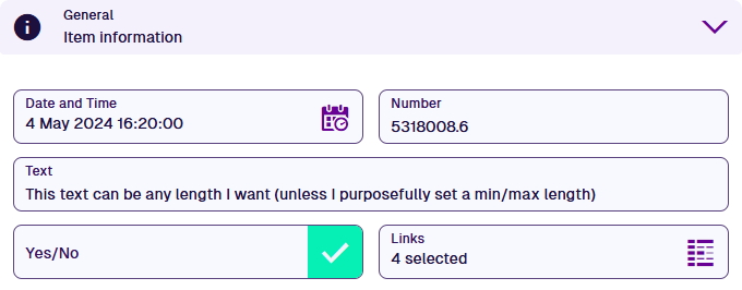 | Link | Store the ID of one or more items of a specific design/interface | Select one or more items with the item picker or map picker | |