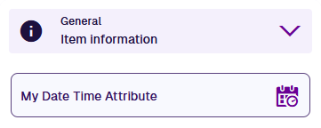 When creating or editing an item, select the attribute to open the calendar picker. Use the purple bar to set the year and month, then select the day. To set the time, select it in the purple bar and type directly into the Hour, Minute and Second boxes.