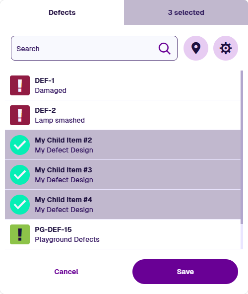 If the items have geometry, you can visualise them on the map. Select Open Map in the item picker to open the map picker. Select items on the map or in the list.