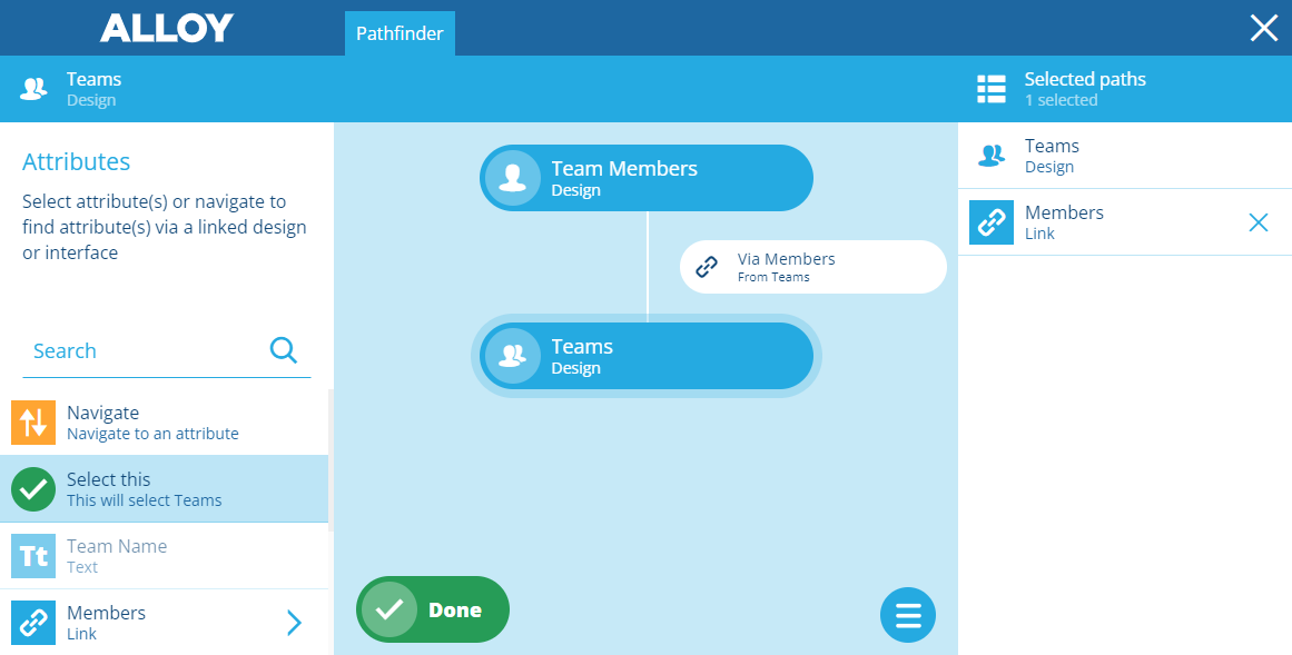 - Select to open the the Pathfinder. On the left, select Navigate > Teams > Via Members > Select this > Done.