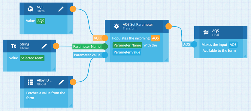For the first three nodes, select their right circle and then select the relevant left circle on the AQS Set Parameter node. Repeat to link the AQS Set Parameter to the final AQS node.