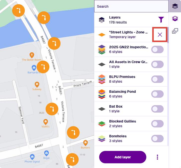 Temporary layers are always turned on. They disappear automatically when you sign out of CausewayOne Asset Management or close the browser tab. To remove a specific temporary layer, select Layers in the right toolbar, and then select its Remove button.