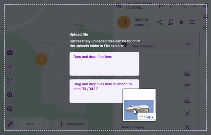 If your device supports dragging and dropping files, use this method to quickly upload and attach a file to the current item: