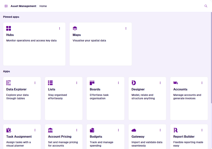 Use the Overview page to access the apps and classic features available to you. It appears by default when starting Asset Management (unless you set a default app instead). To open this page at any time, select Overview in the left panel.