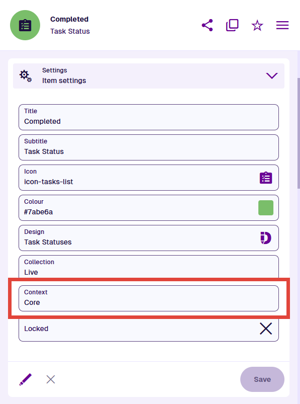 To check the context of an item, open the item to view its details and then scroll to the Settings section.