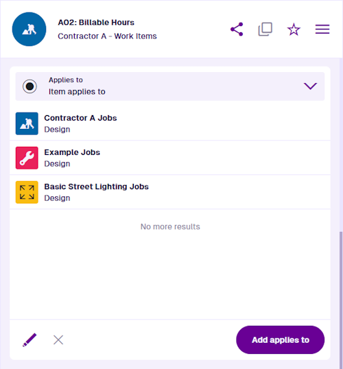 A work item must apply to one or more job designs or job interfaces. When creating job work items for those jobs, this ensures that only suitable work items are available to choose from, e.g. "Contractor A" work items can only be added to "Contractor A" jobs.