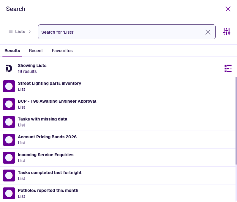 Recent - things you've recently viewed across the Asset Management Apps, including lists, items and other features.