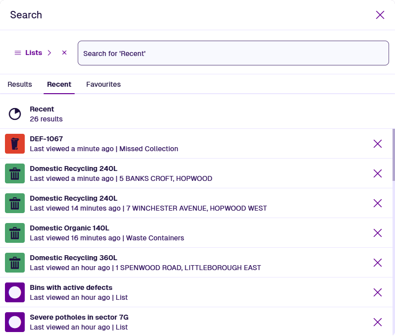 For a list of recently viewed items and lists, switch to the Recent tab. To remove an item from the list, select its button.