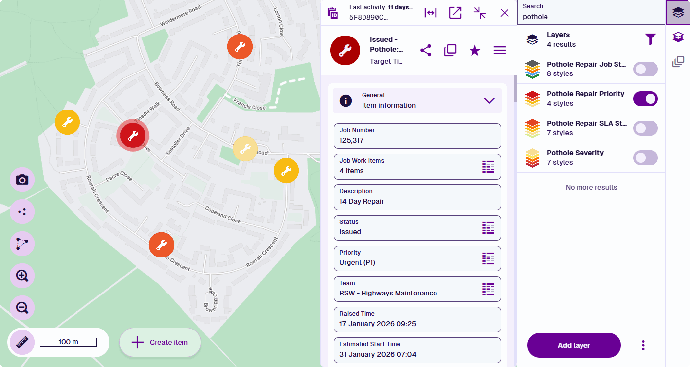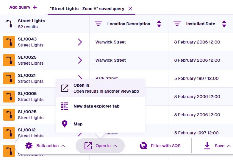 When you're working with a set of items in another Asset App, it's often possible to open those items in the Maps app. Want to see all jobs in progress? All street lights maintained by a particular team? All defects reported within an operational zone in the last 12 months? No problem!