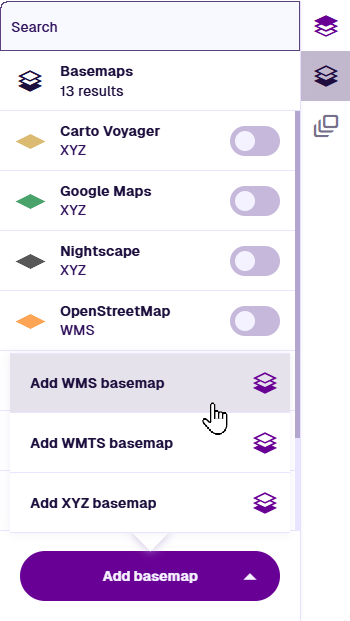 To begin, select Basemaps in the right toolbar, select Add basemap and choose one of the following.