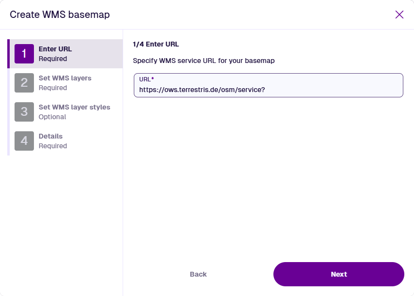 This step is required. Enter the URL of the WMS map service you want to use. A variety of URL formats are accepted, such as: