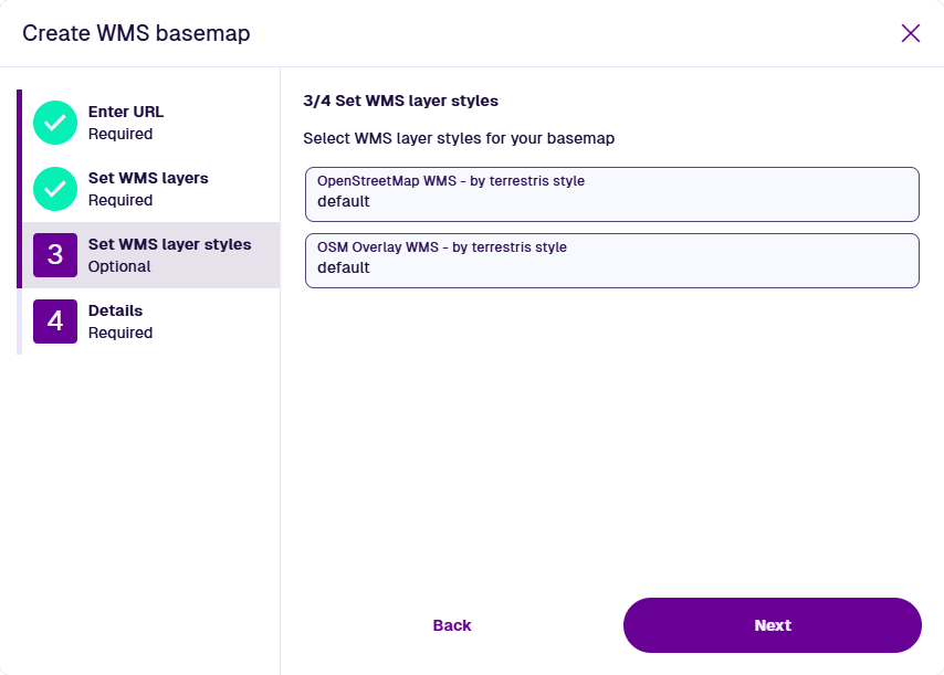 This step is required. For each previously selected layer, choose an available style provided by the map service. A layer may have multiple styles or a single default one. If no styles are available, you can leave the field blank.