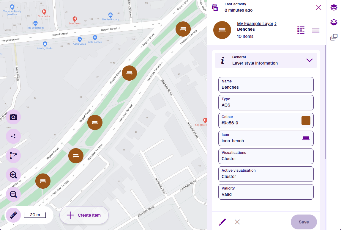 The design layer style illustrated below shows items of the Benches design on the map.