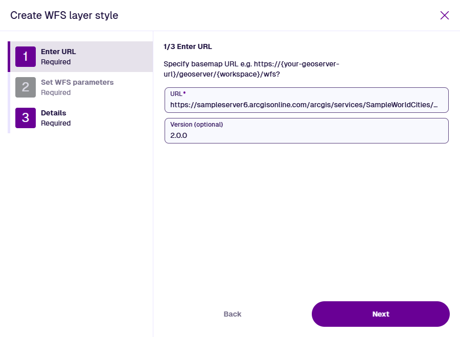 URL - enter the address of the WFS map service you want to use. A variety of URL formats are accepted, such as: