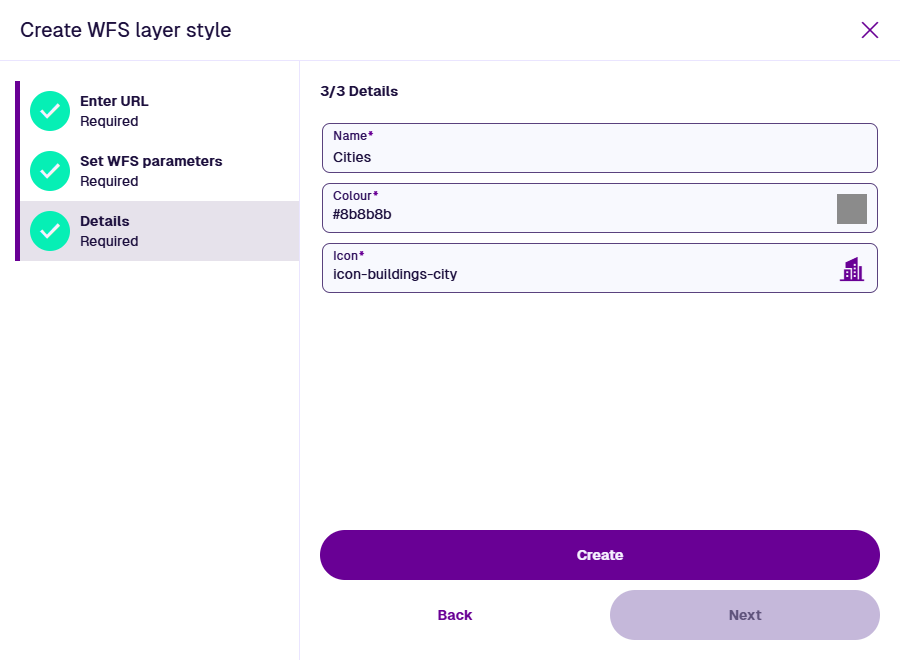 To check your configuration and see how the data will look on the map, select Preview WFS layer style. When you're done, select the bottom button to return to the wizard.