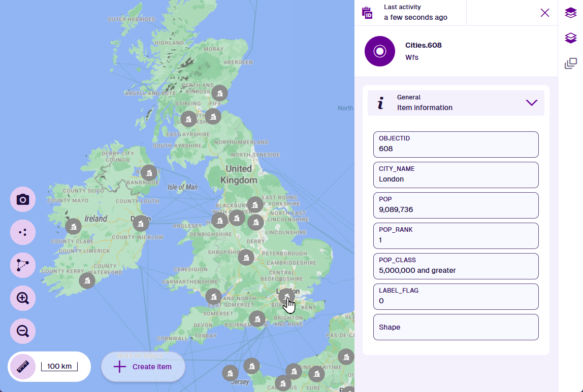 WFS is an international protocol for serving vector graphics of geographical features, e.g. places, buildings, rivers, zones. Unlike other map services, WFS provides the data associated with each geographical feature instead of map images. This data can be used to represent those geographical features as items on the map, which display their full data when selected.