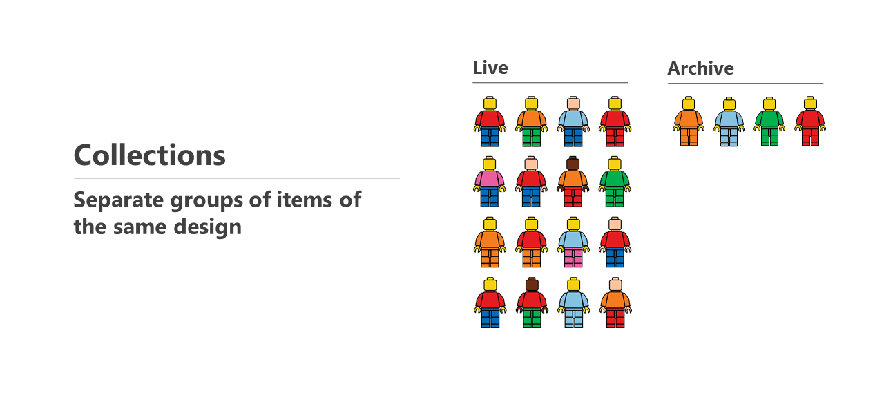 Continuing our toy example, the illustration below shows items of the Minifigures design. Items in active use are kept in the Live collection. Items no longer in use are kept in the Archive collection.