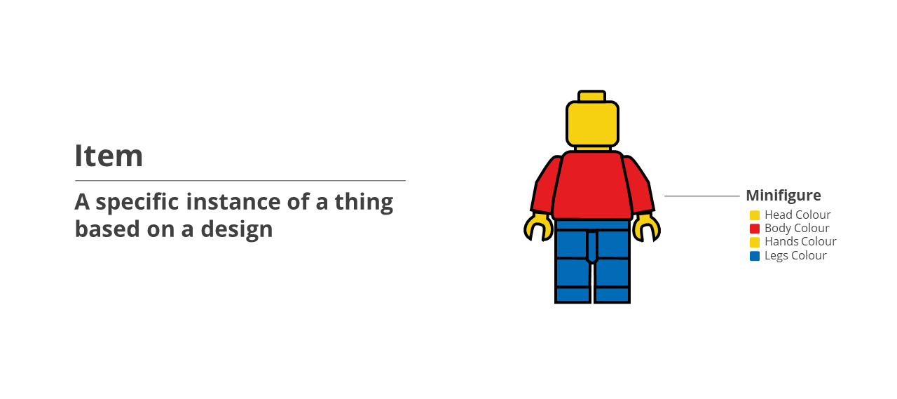 Continuing our toy example, the item illustrated below is a specific instance of the Minifigure design. It contains a value for each colour attribute defined by the design. The item represents an actual configuration of the minifigure.