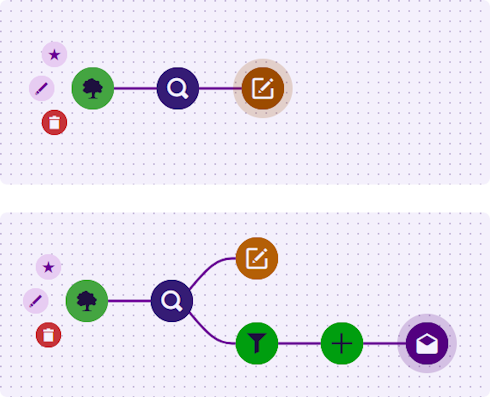 The action sequence can be linear or have multiple branches. This enables a single trigger to spark multiple actions at once. You can also use Filter actions to enforce conditional logic, so that certain branches are only performed for certain items.