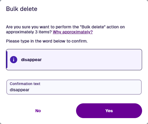 Bulk actions can potentially make sweeping changes to lots of data, which may be difficult to revert. Therefore, before any bulk action is performed, a confirmation window will appear.